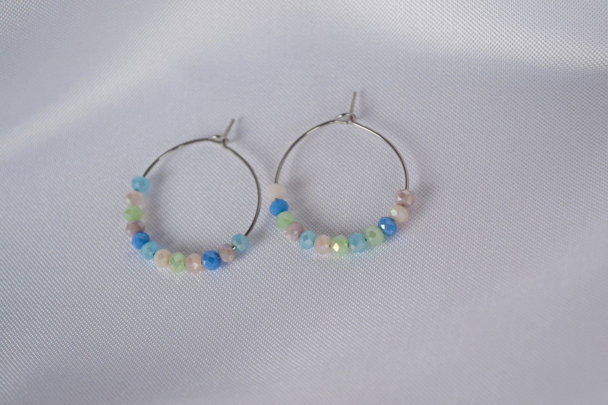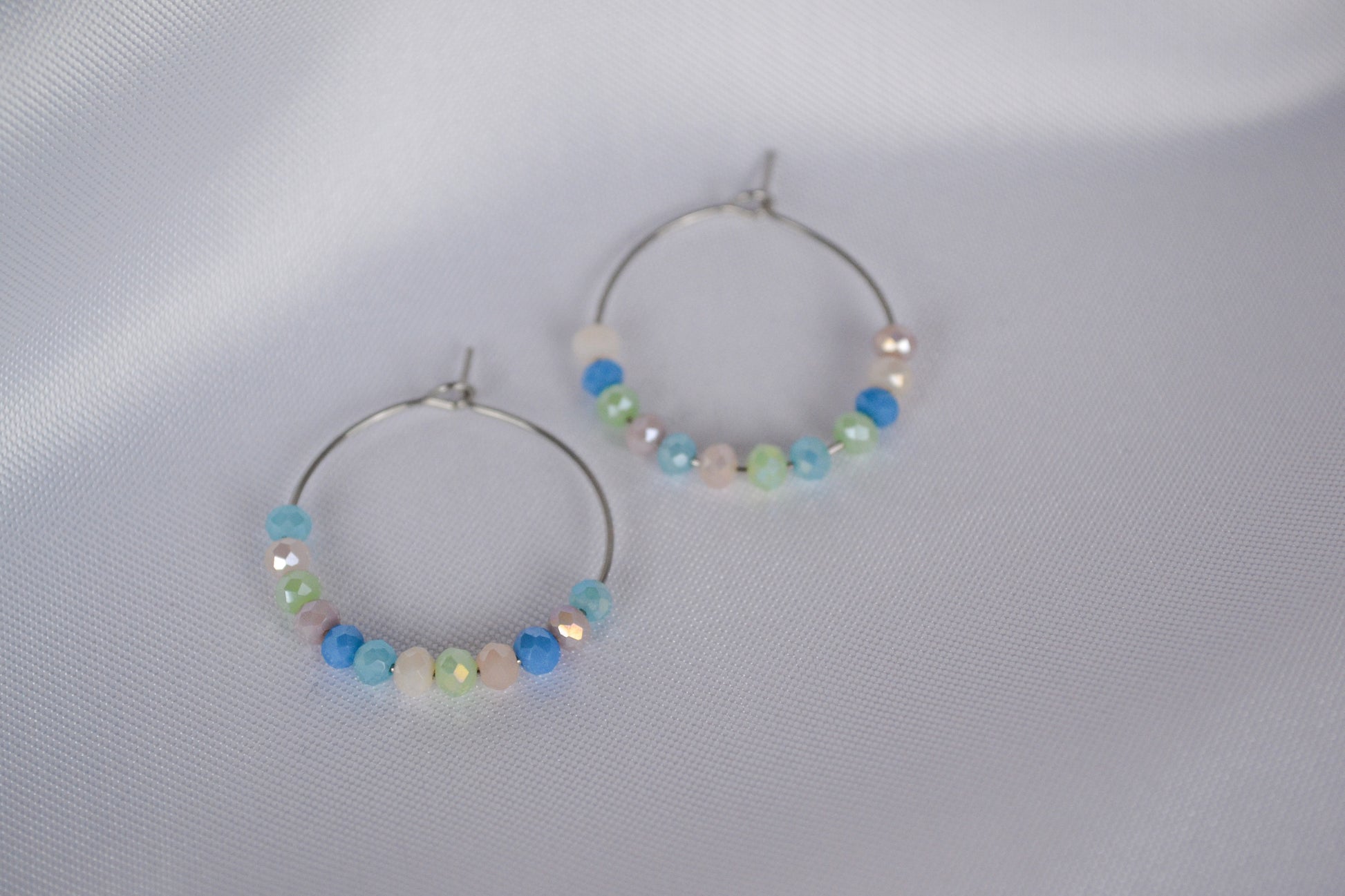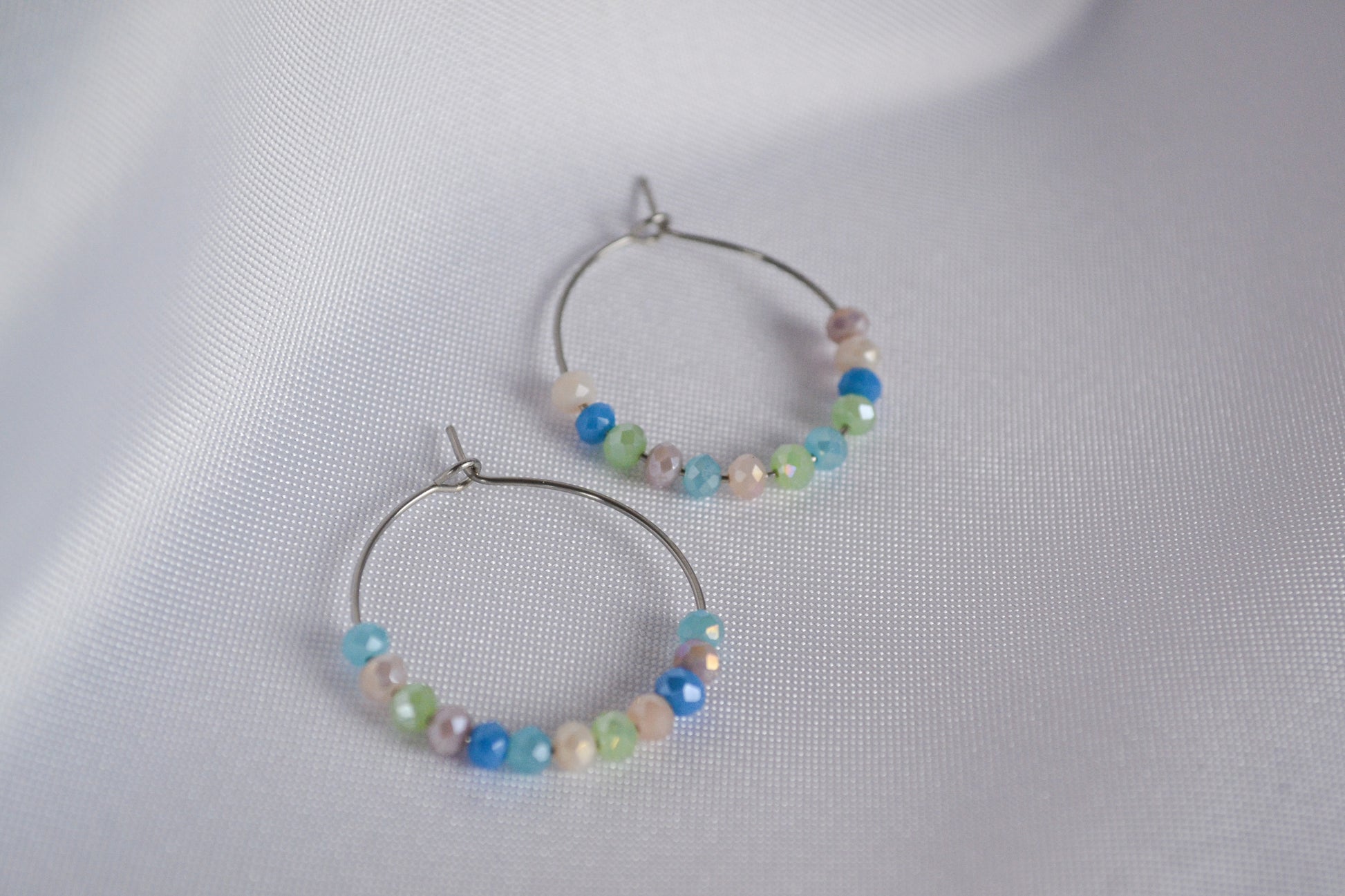 The 25 mm stainless steel hoop earrings, available in gold or silver, are adorned with delicate, faceted glass beads in pastel colors. The colorful beads catch the light and add subtle shimmering color accents to your outfit—ideal for those who want to enhance their natural beauty.