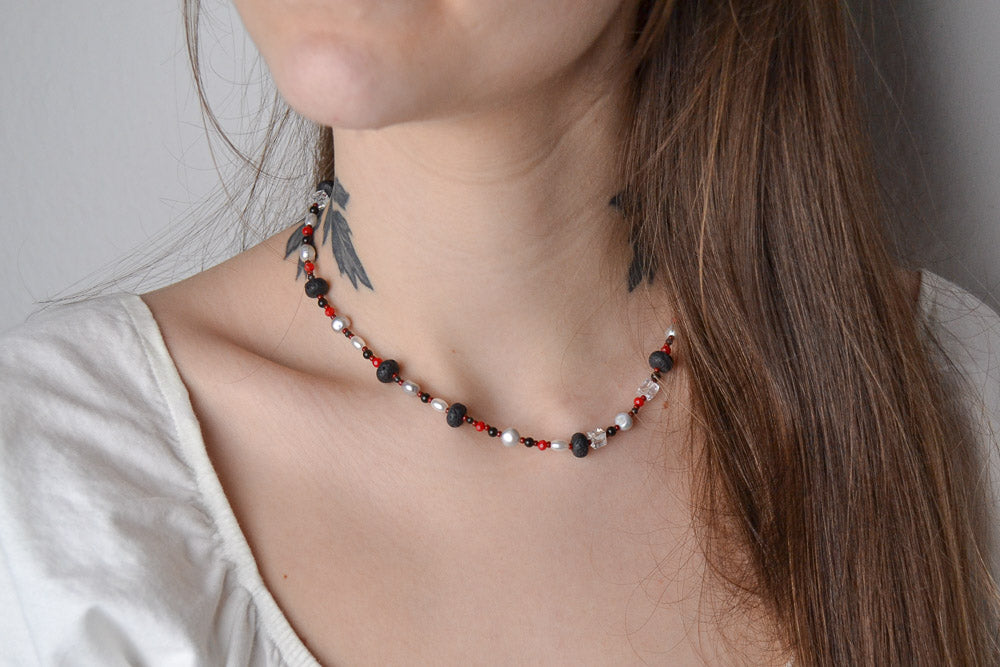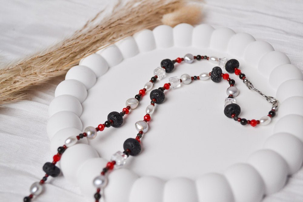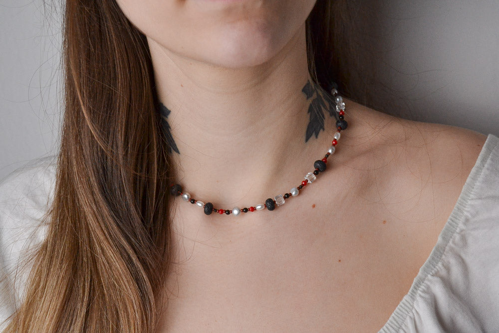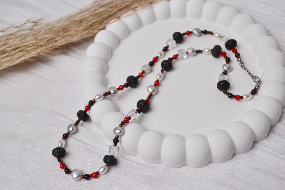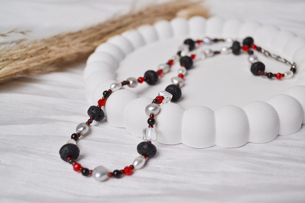 Our "Ruby" necklace is made from a random mix of pearls, making each necklace unique. Ruby is made from silver freshwater pearls, wax pearls, lava stone, (polished) glass beads, and obsidian.