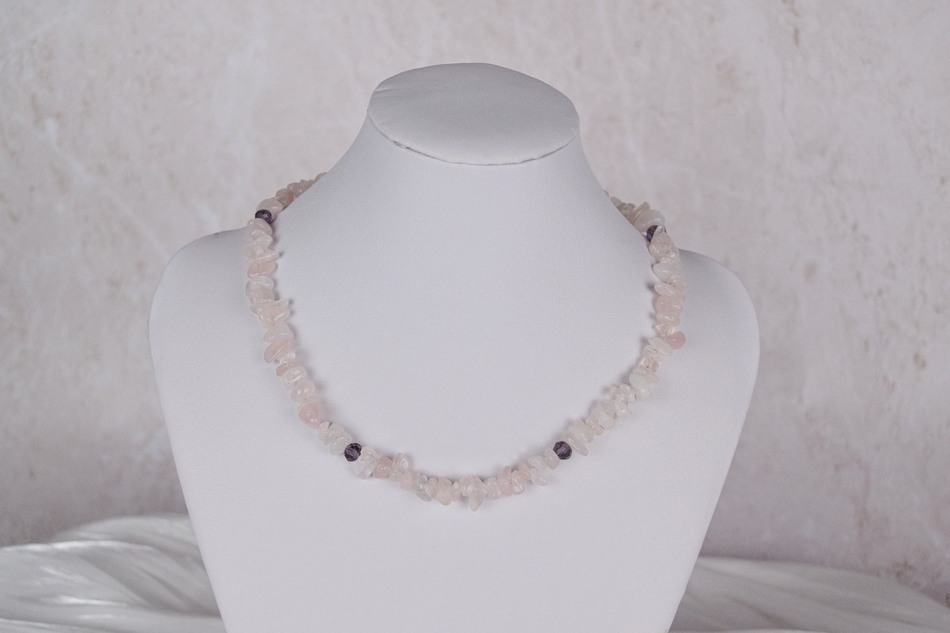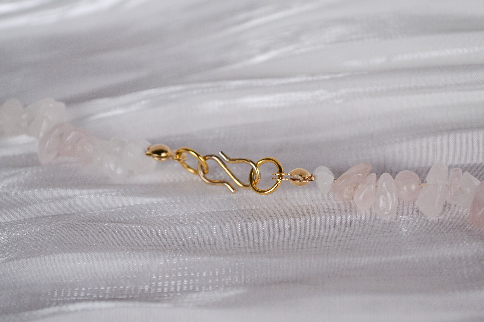 - Material: natürlicher Rosenquartz, Glasperlen, Edelstahl