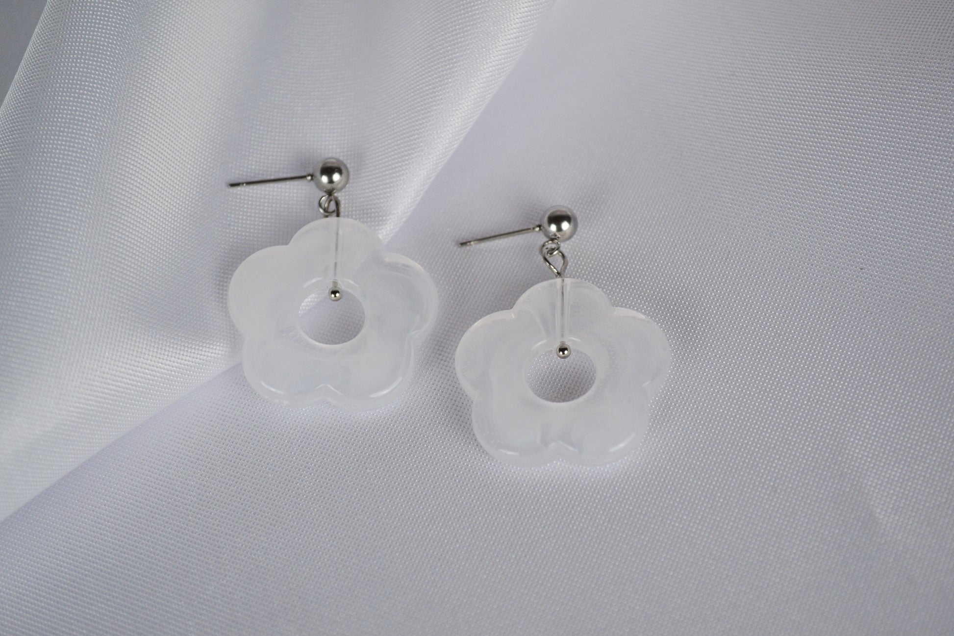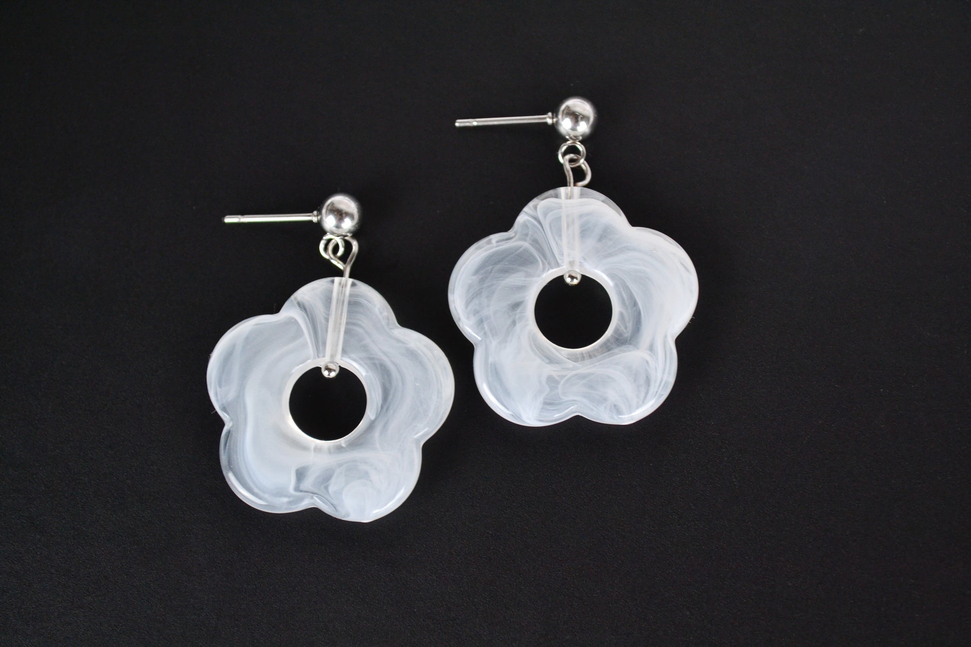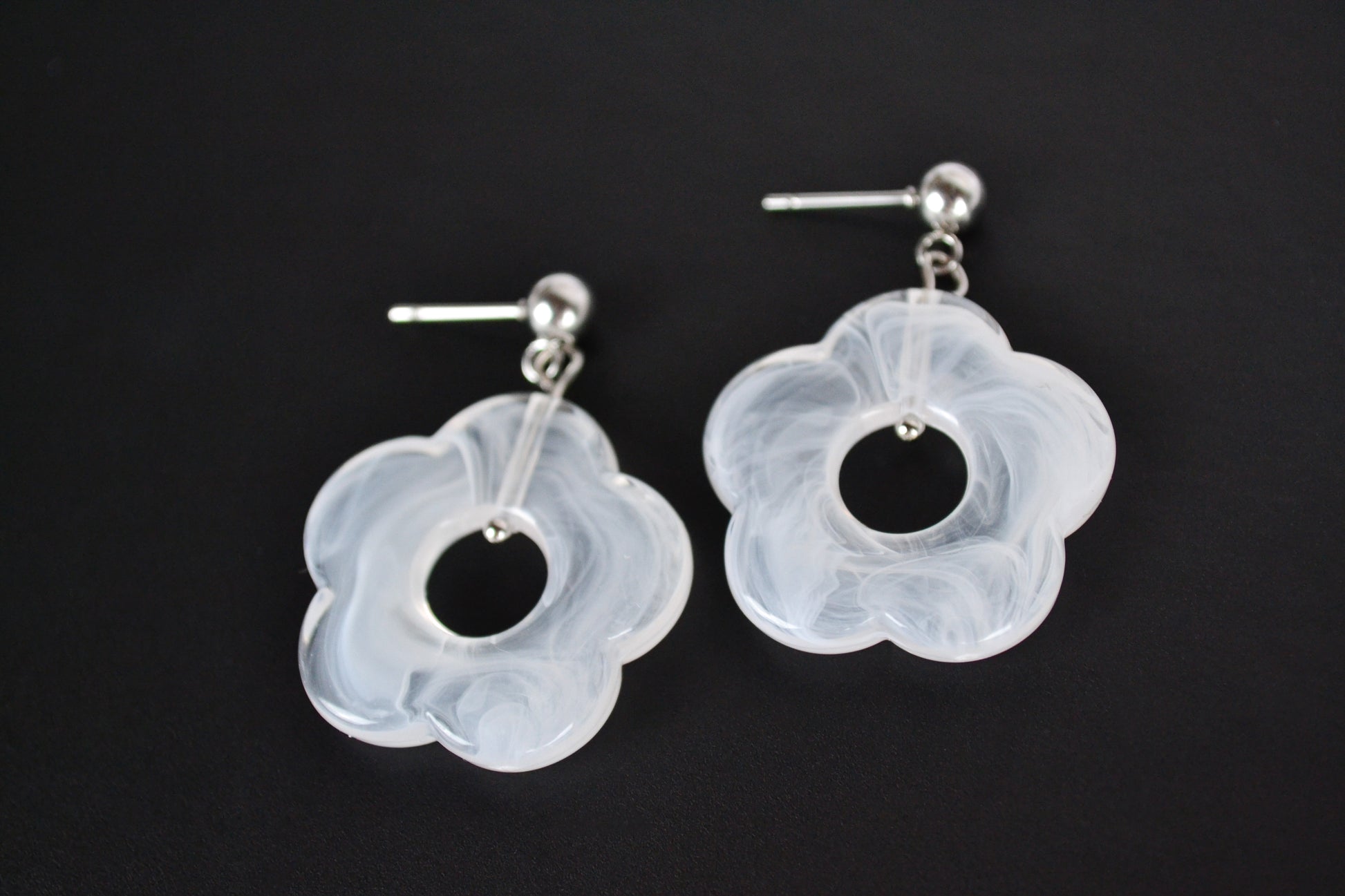 Ein weiterer Teil unserer Basic-Kollektion: Weiß-Transparente Acryl-Blumenanhänger an Kugelsteckern. Die Blumen sind von einem organischen Muster durchzogen und wirken erst so richtig, wenn Licht auf sie fällt und man sie an den Ohren trägt.