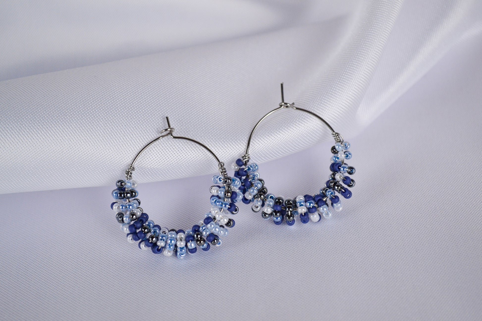 Handgewickelte Perlen Creolen aus zarten Saatperlen in unterschiedlichen Blautönen und dunklem Silber.