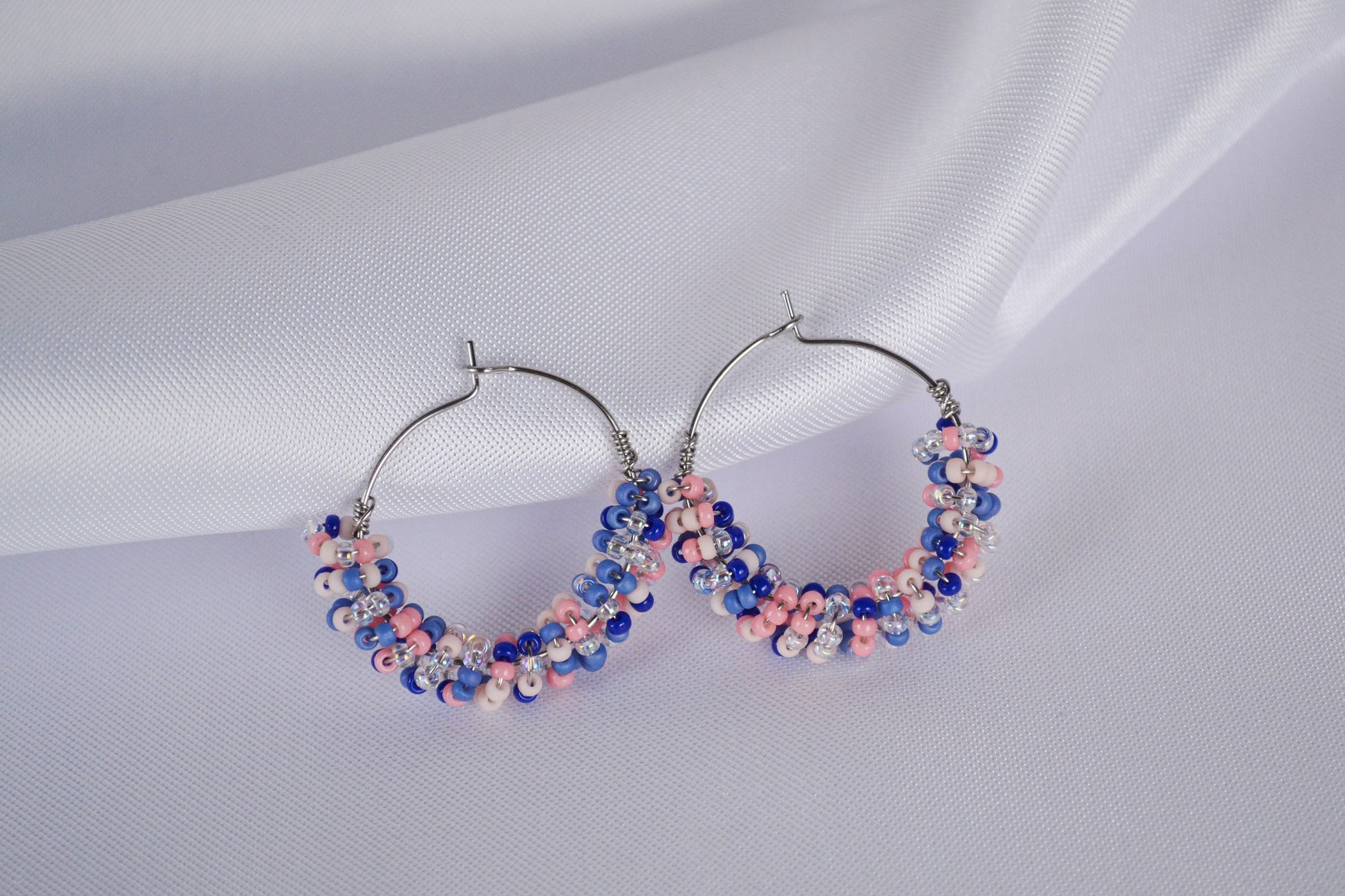 Handgewickelte Perlen Creolen aus zarten Saatperlen in Blau, Pink und Kristall.